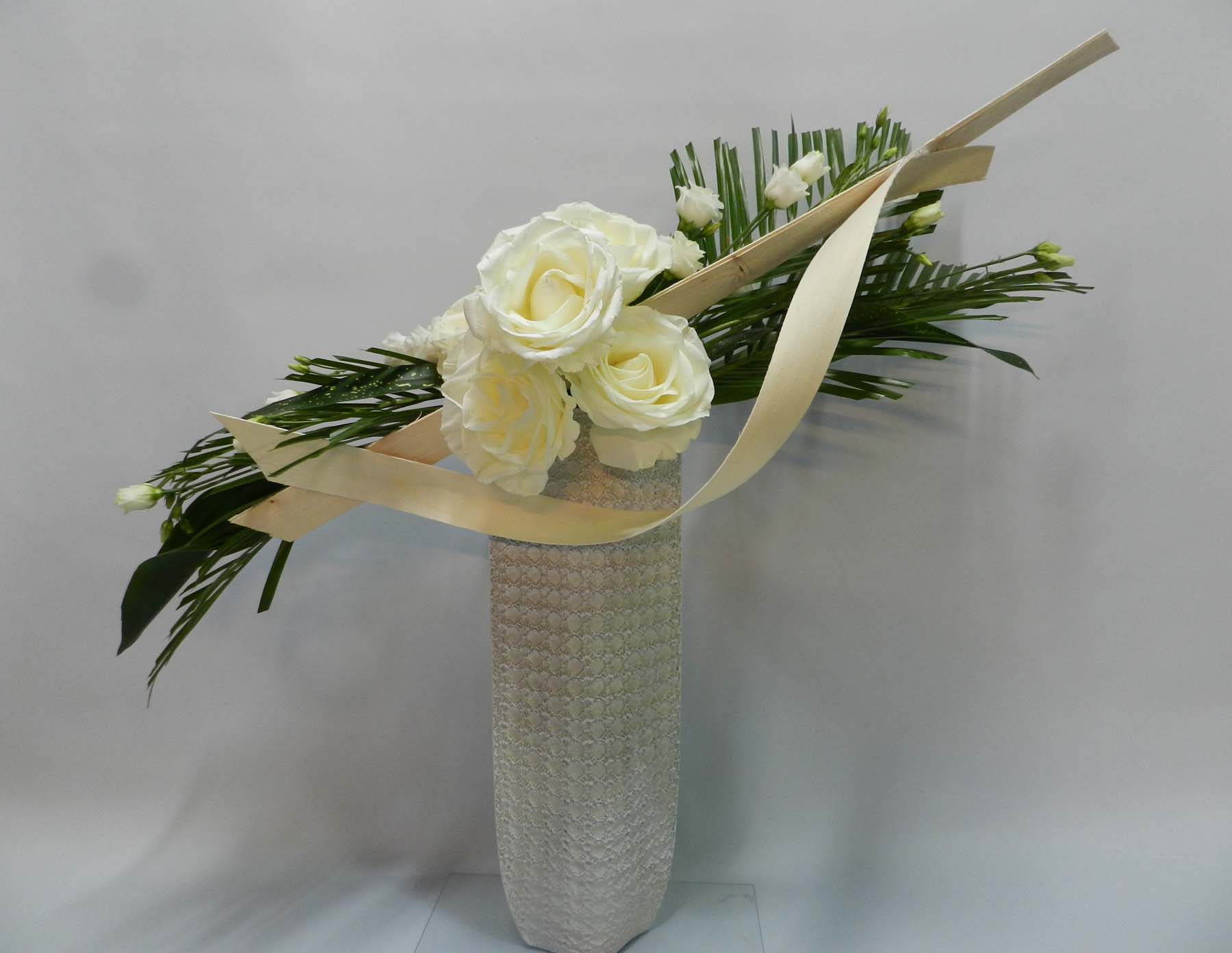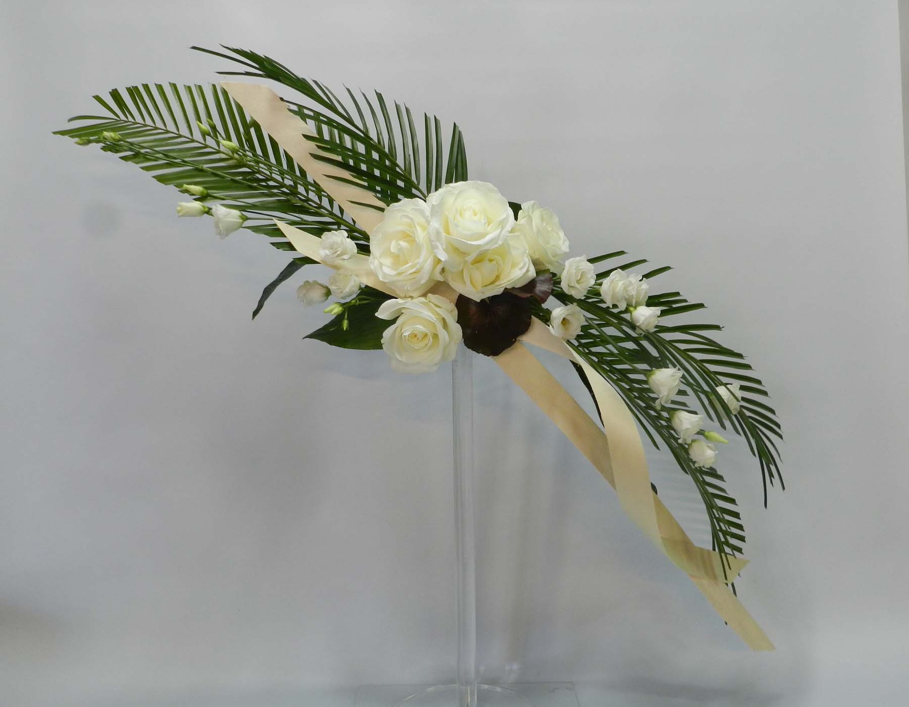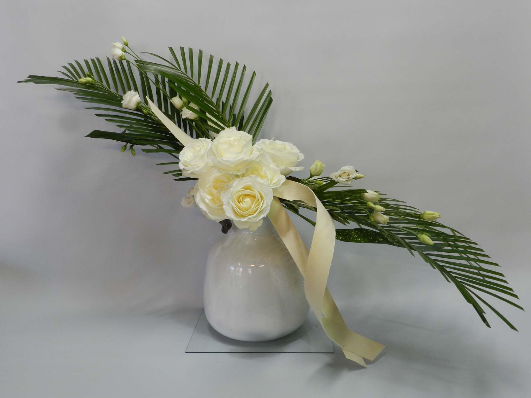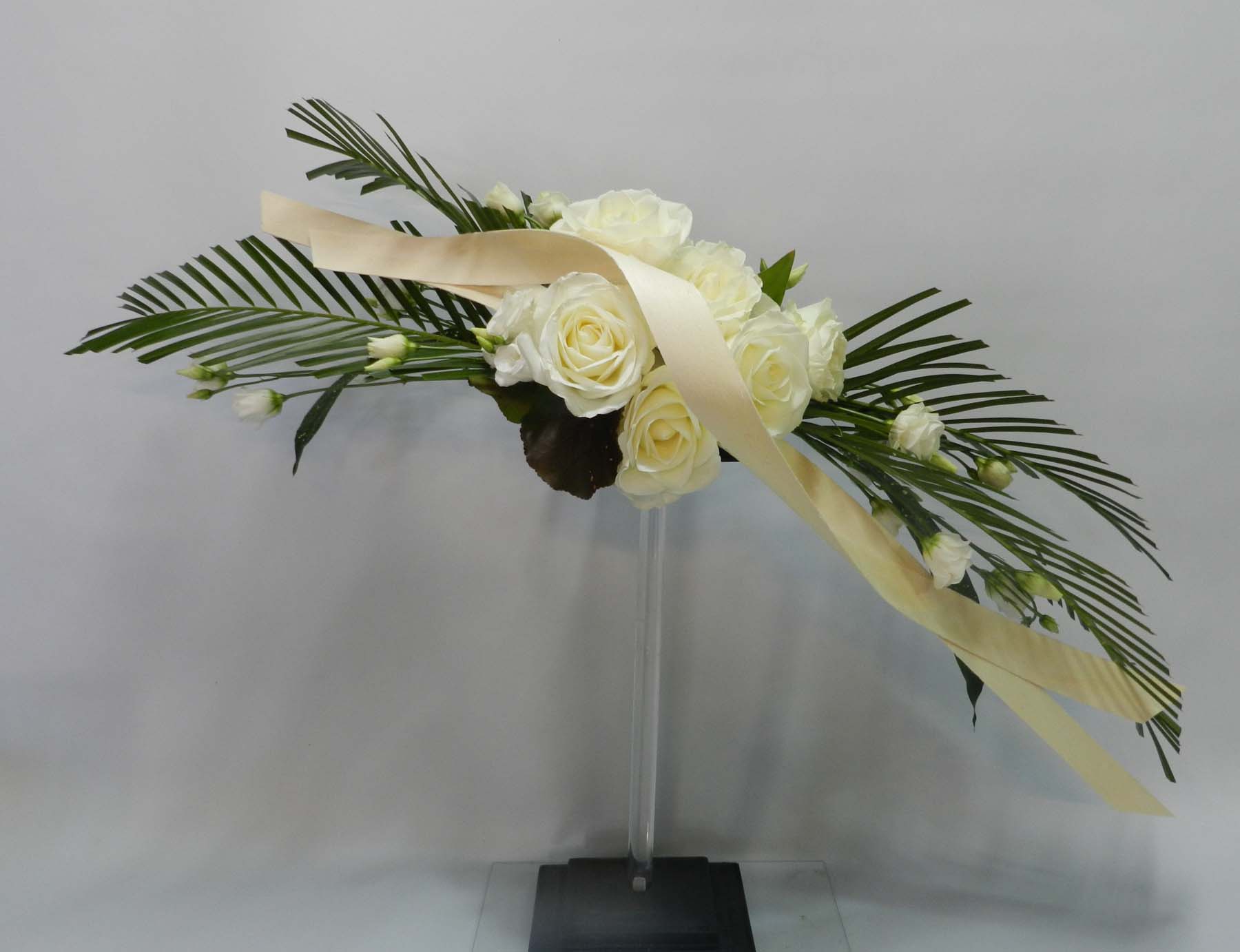 Phénix, aspidistra panaché, rose blanche et lysianthus.