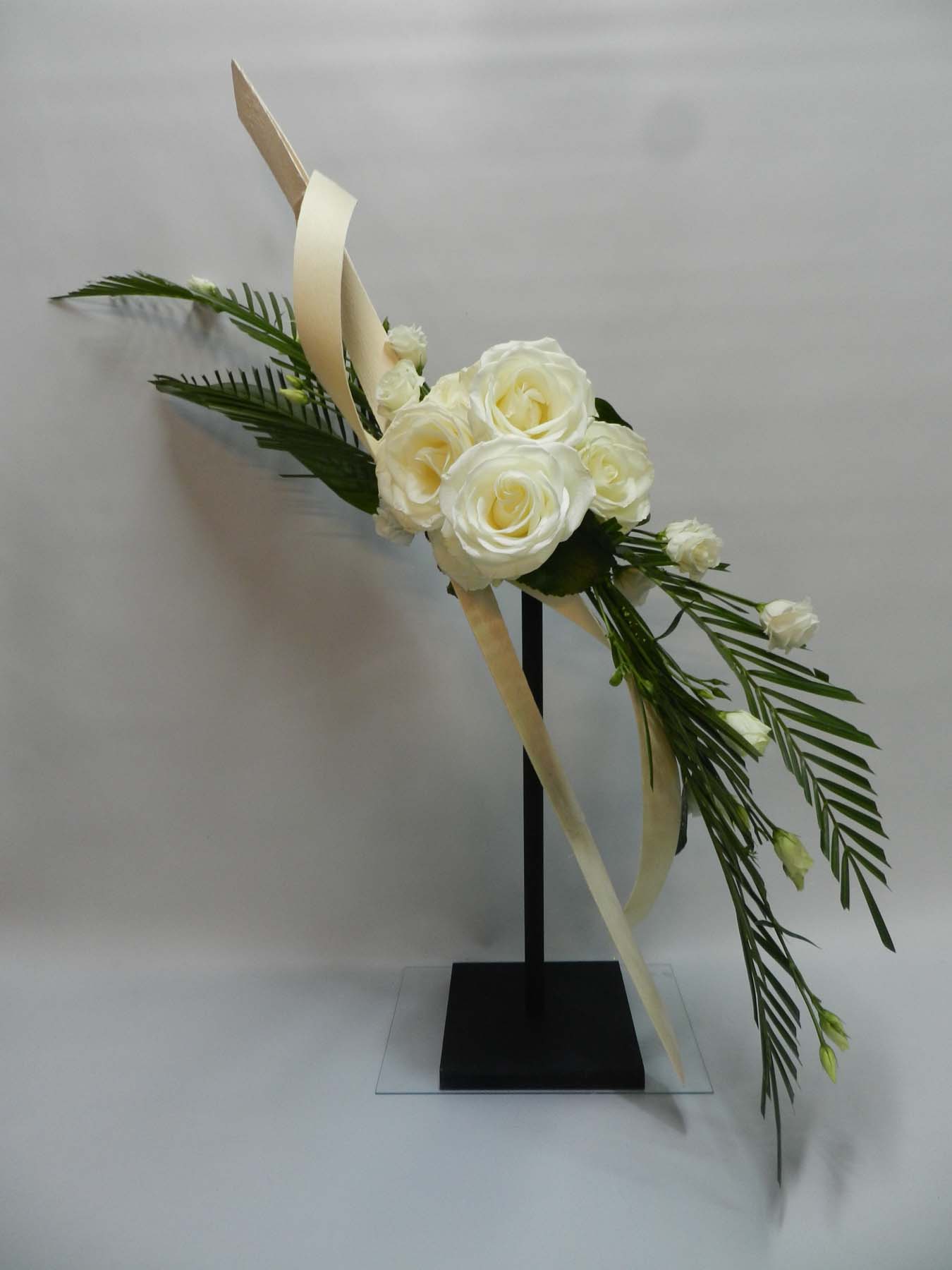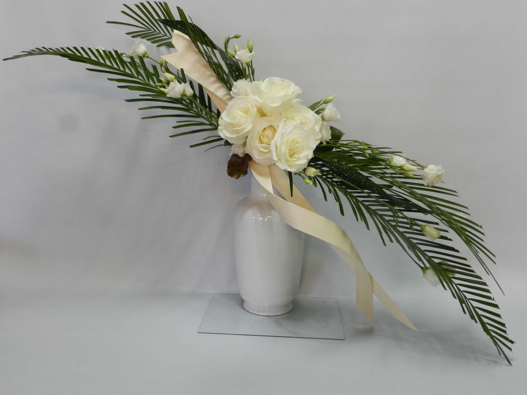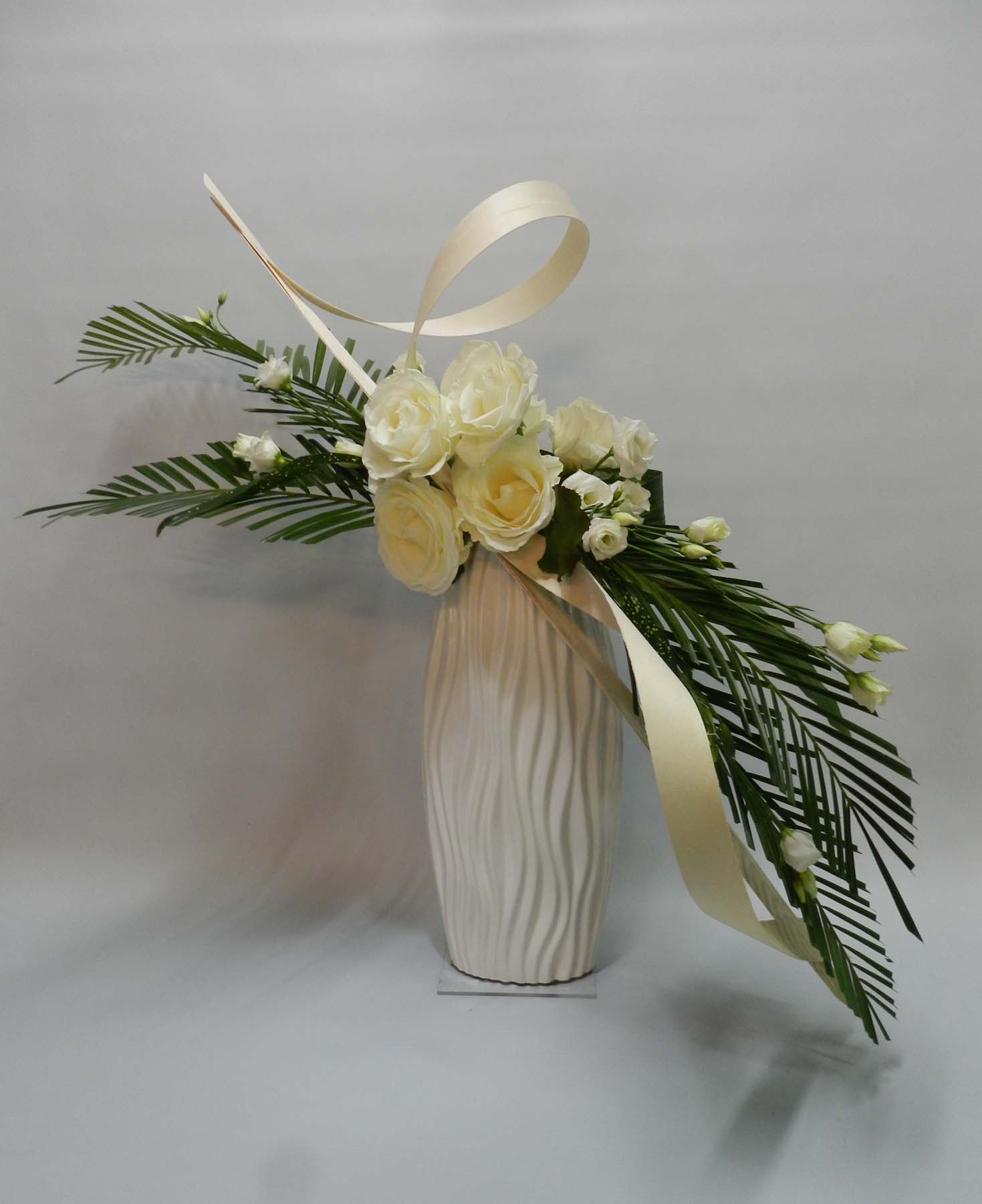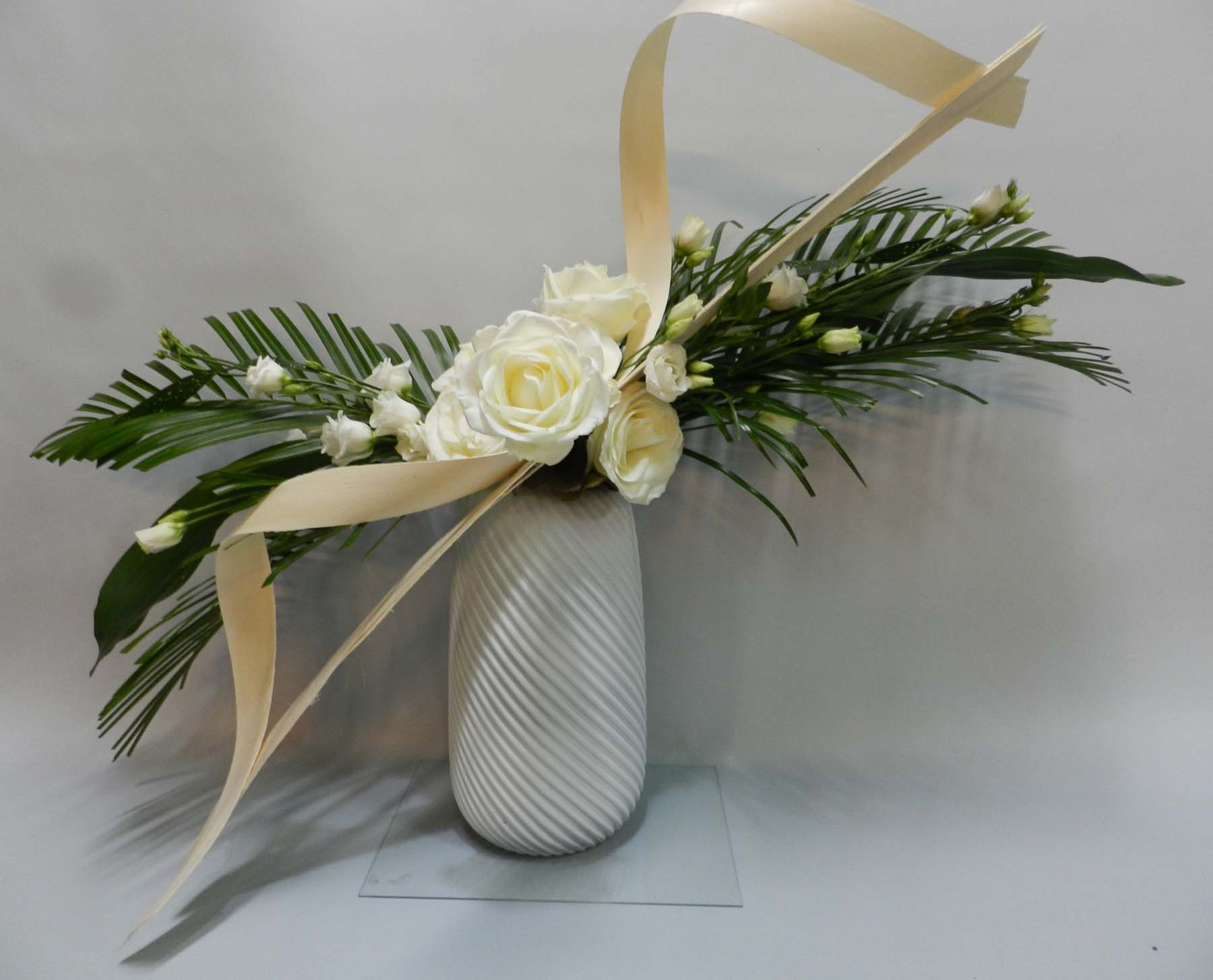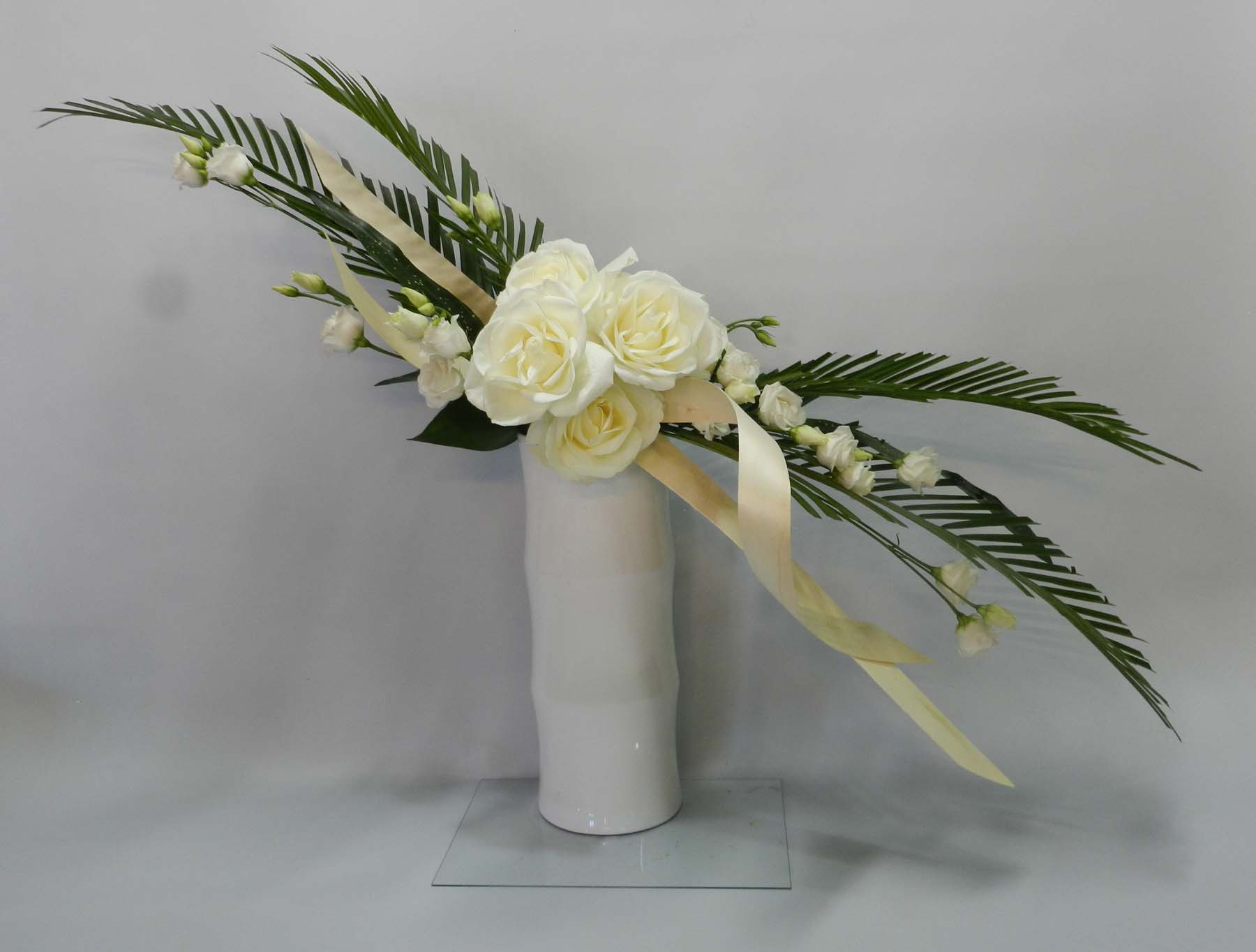 Phénix, aspidistra panaché, rose blanche et lysianthus.