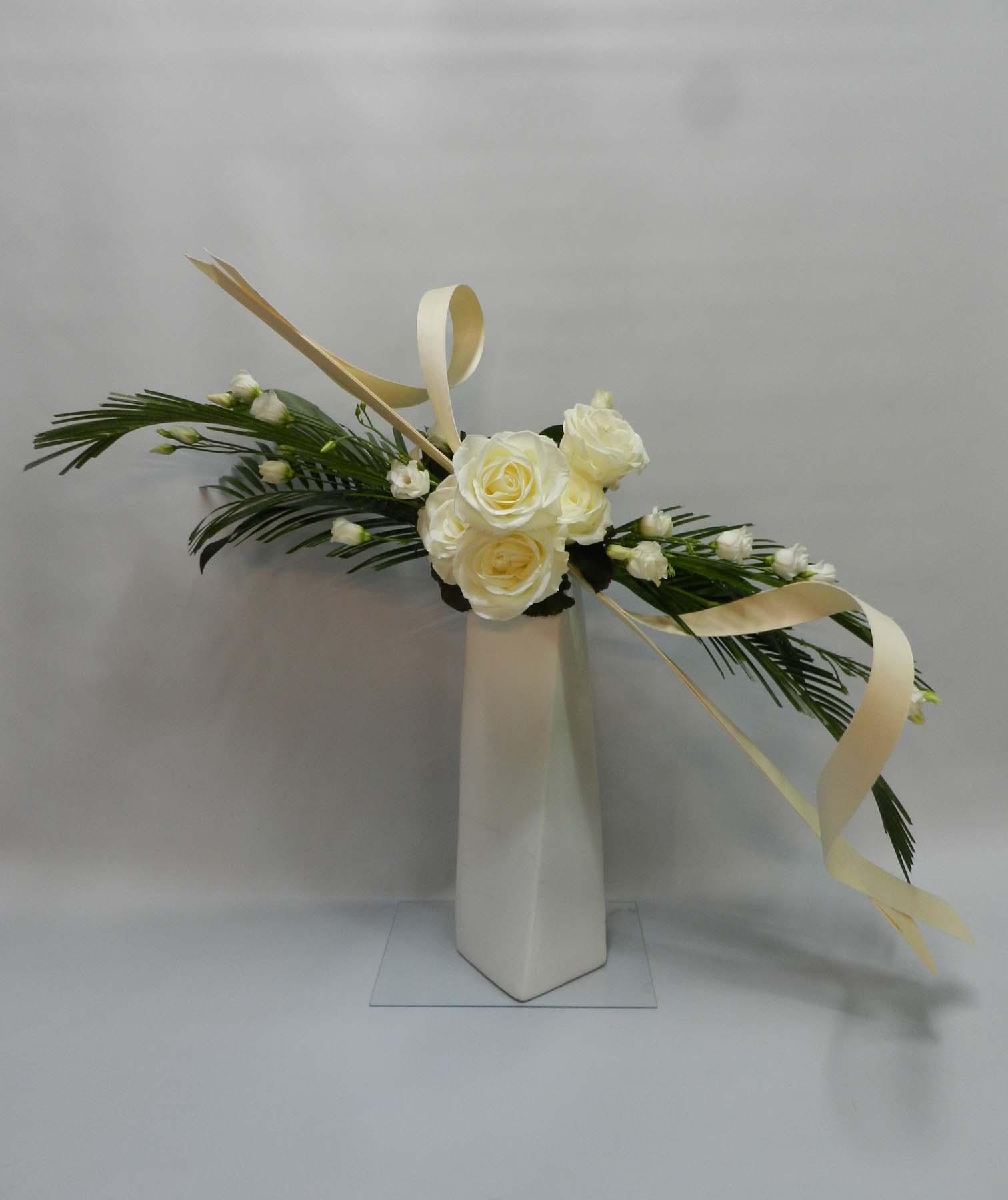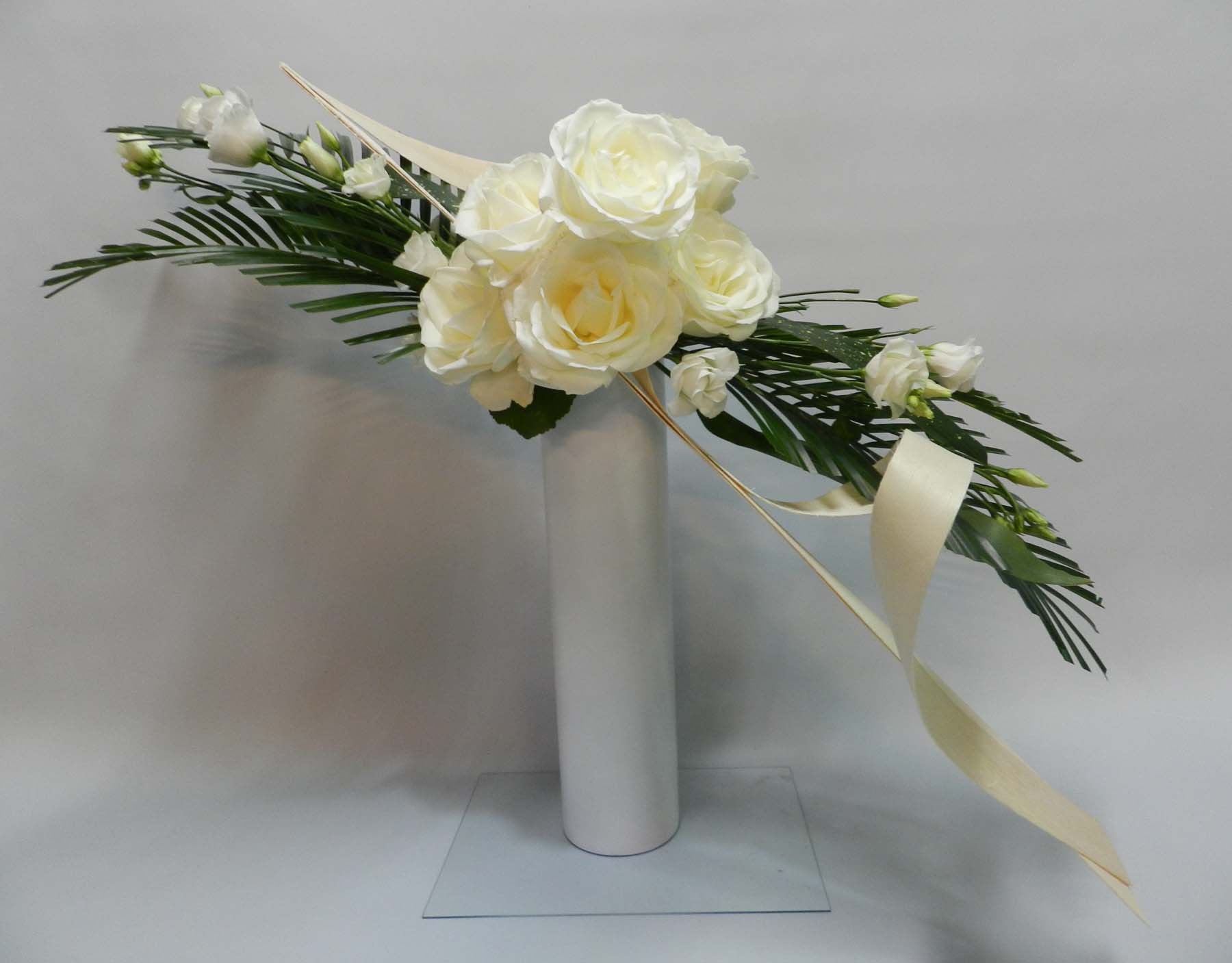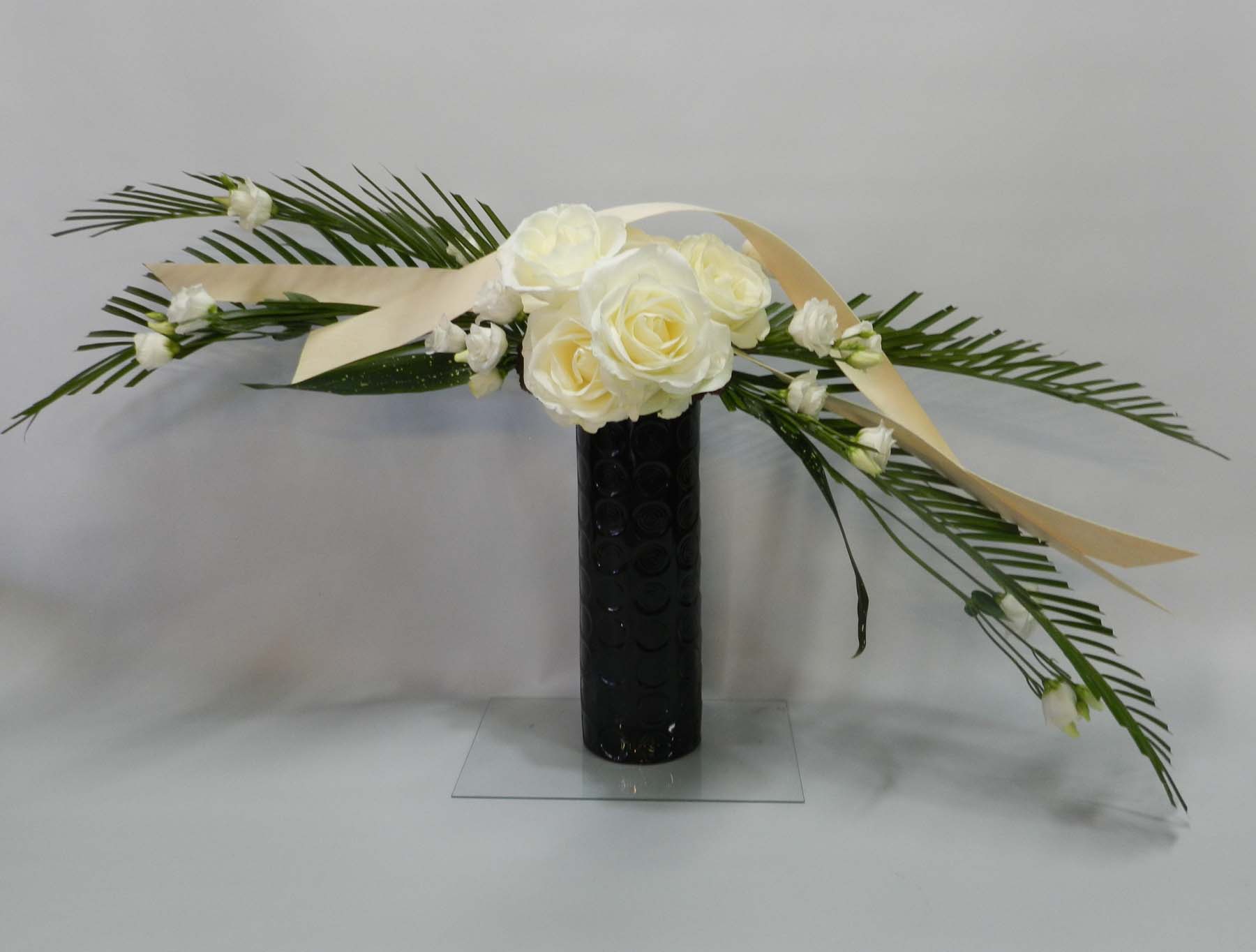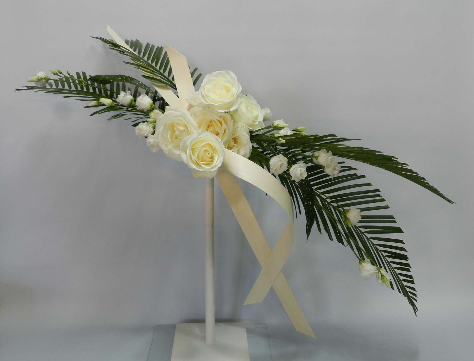 Phénix, aspidistra panaché, rose blanche et lysianthus.