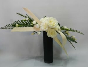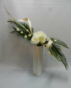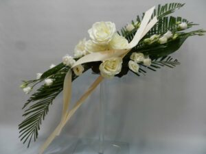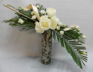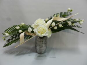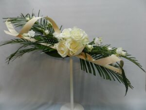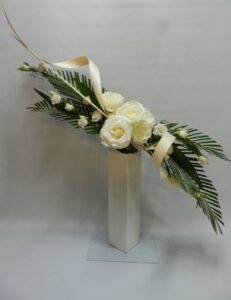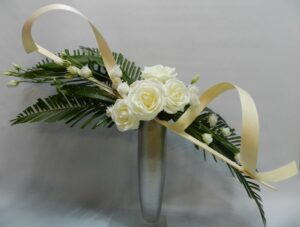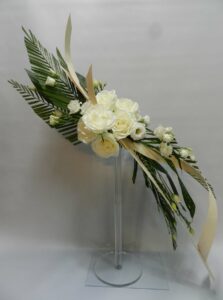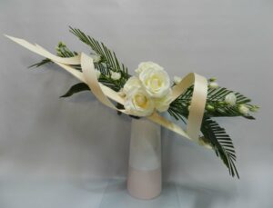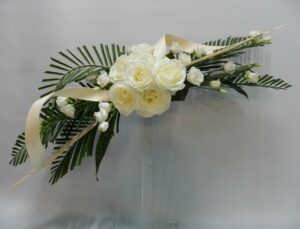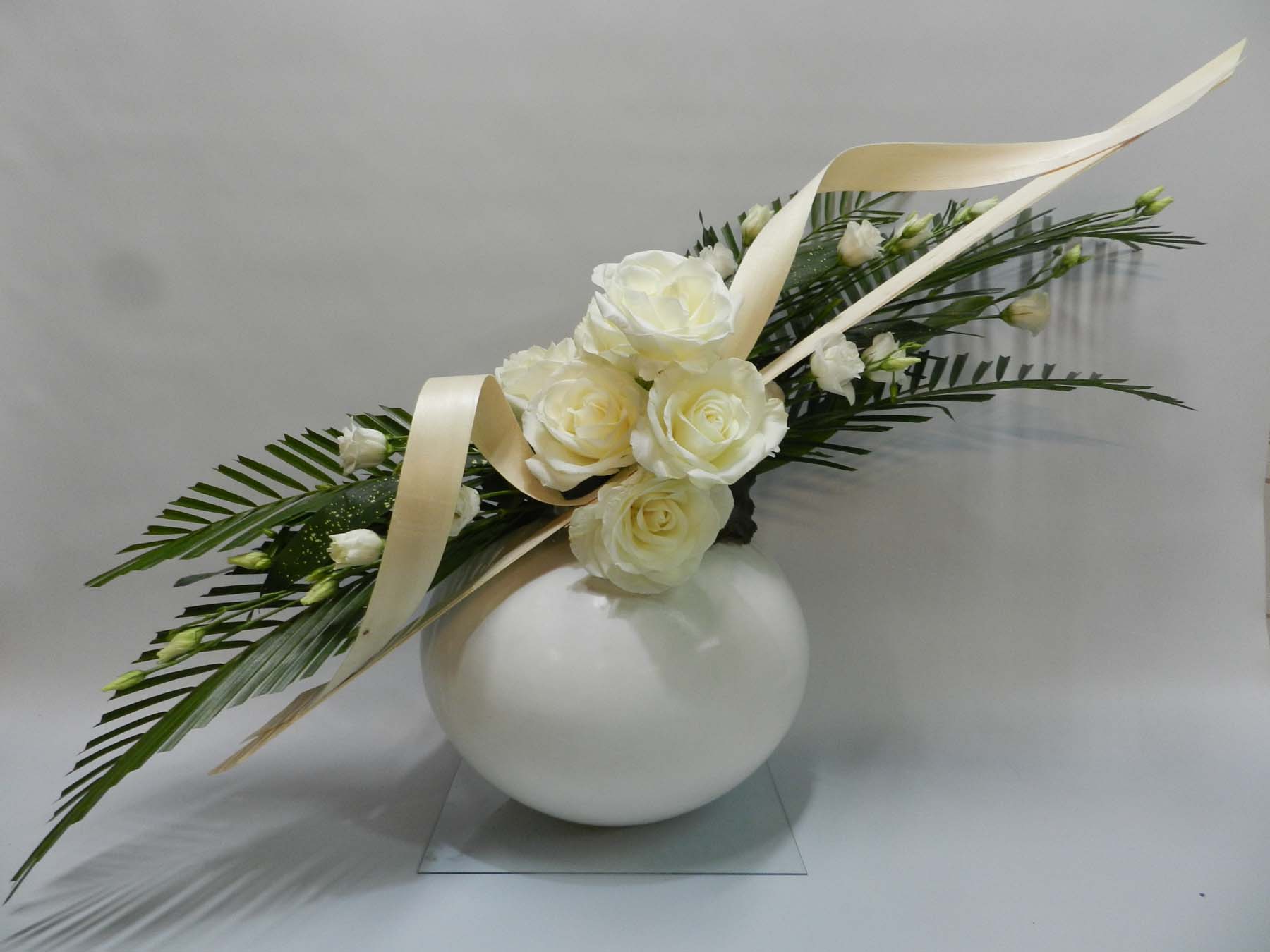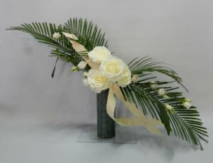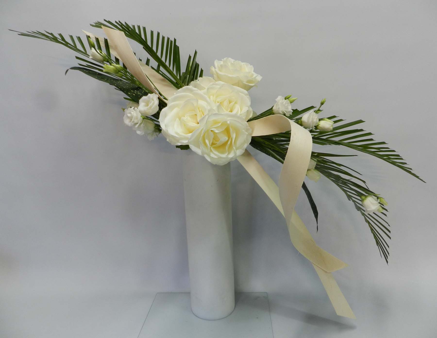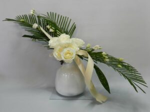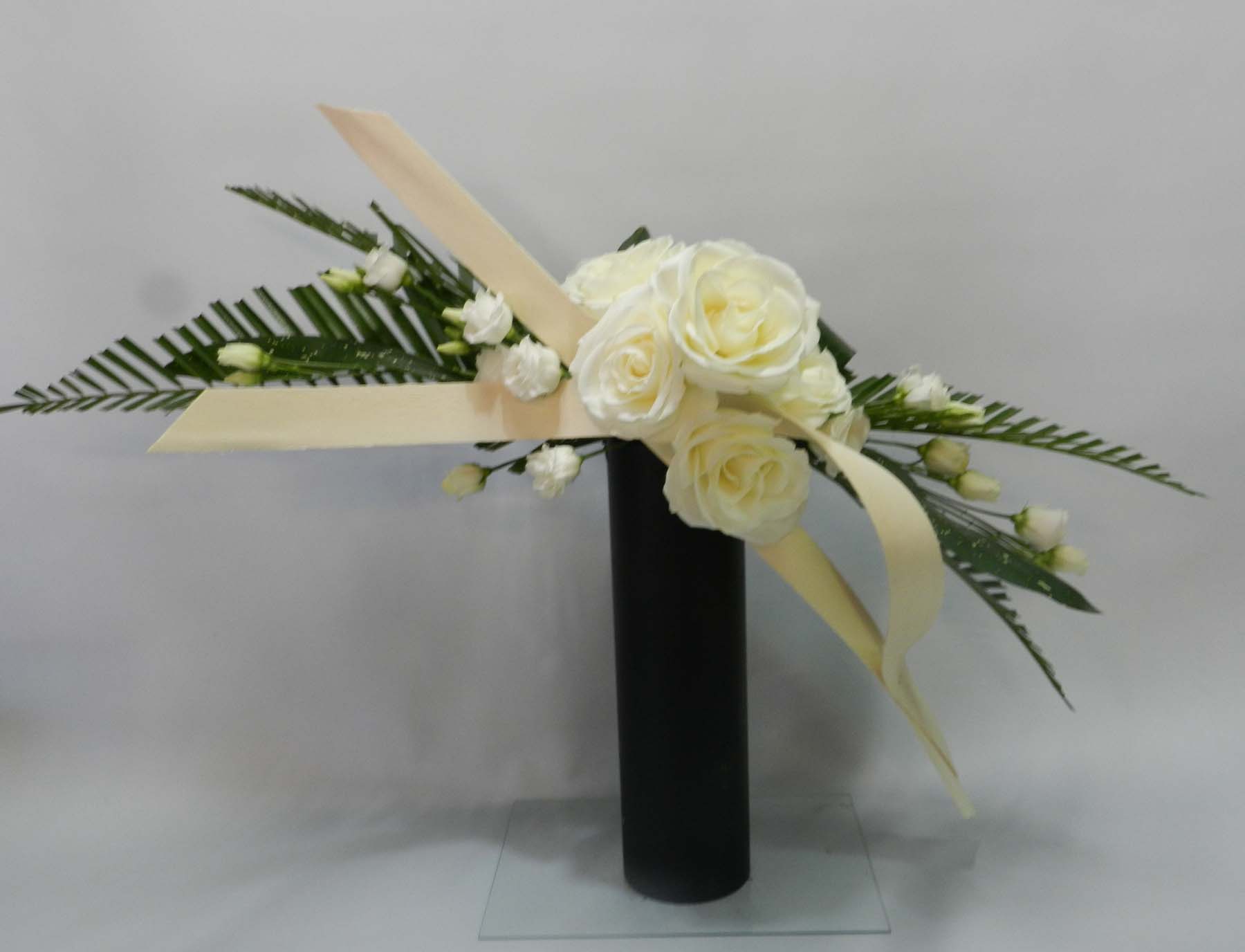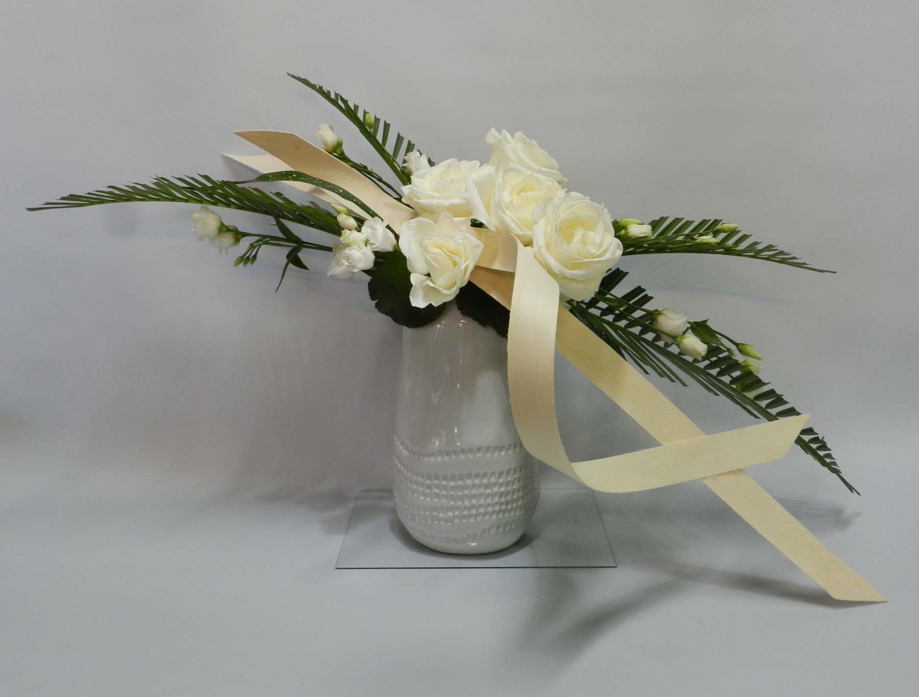 Phénix, aspidistra panaché, rose blanche et lysianthus.