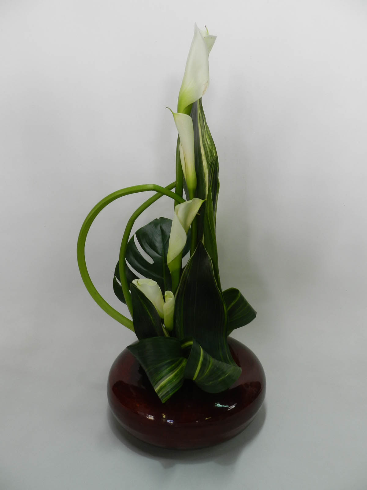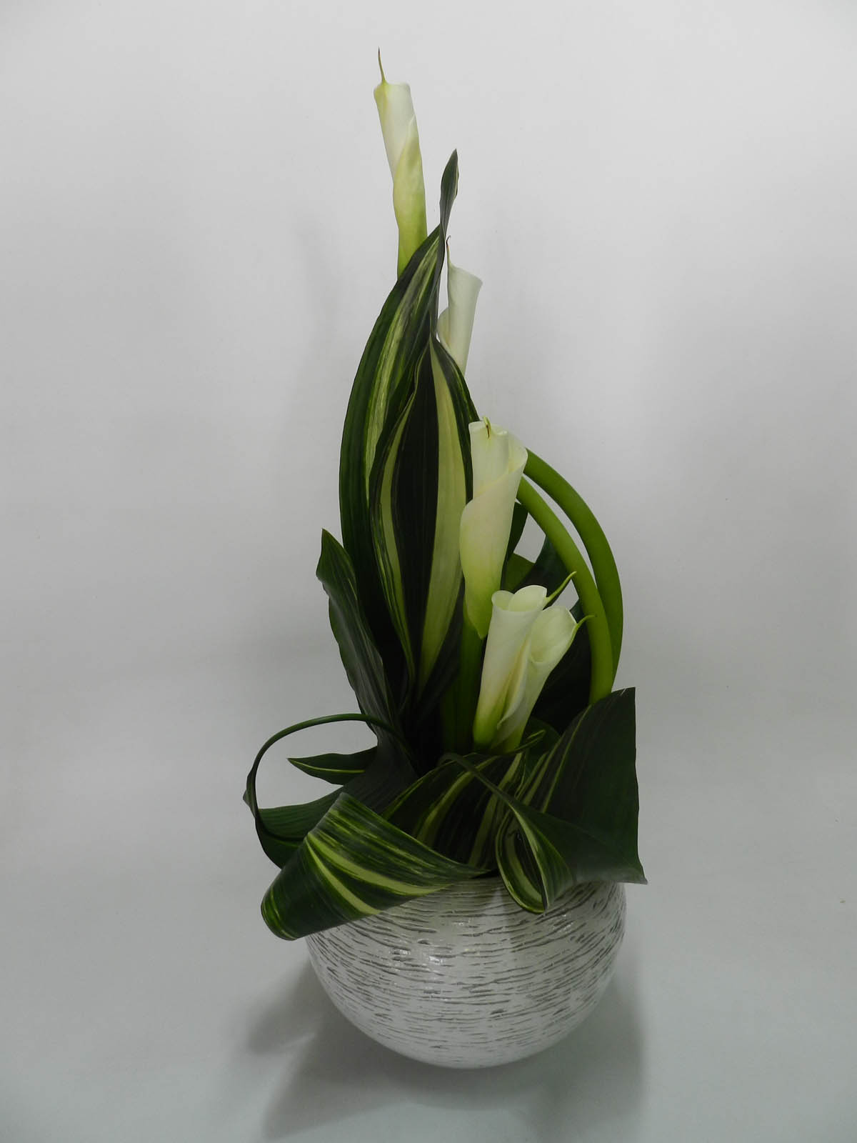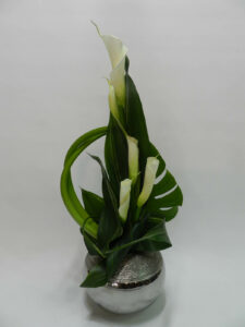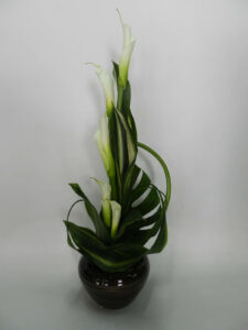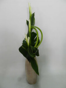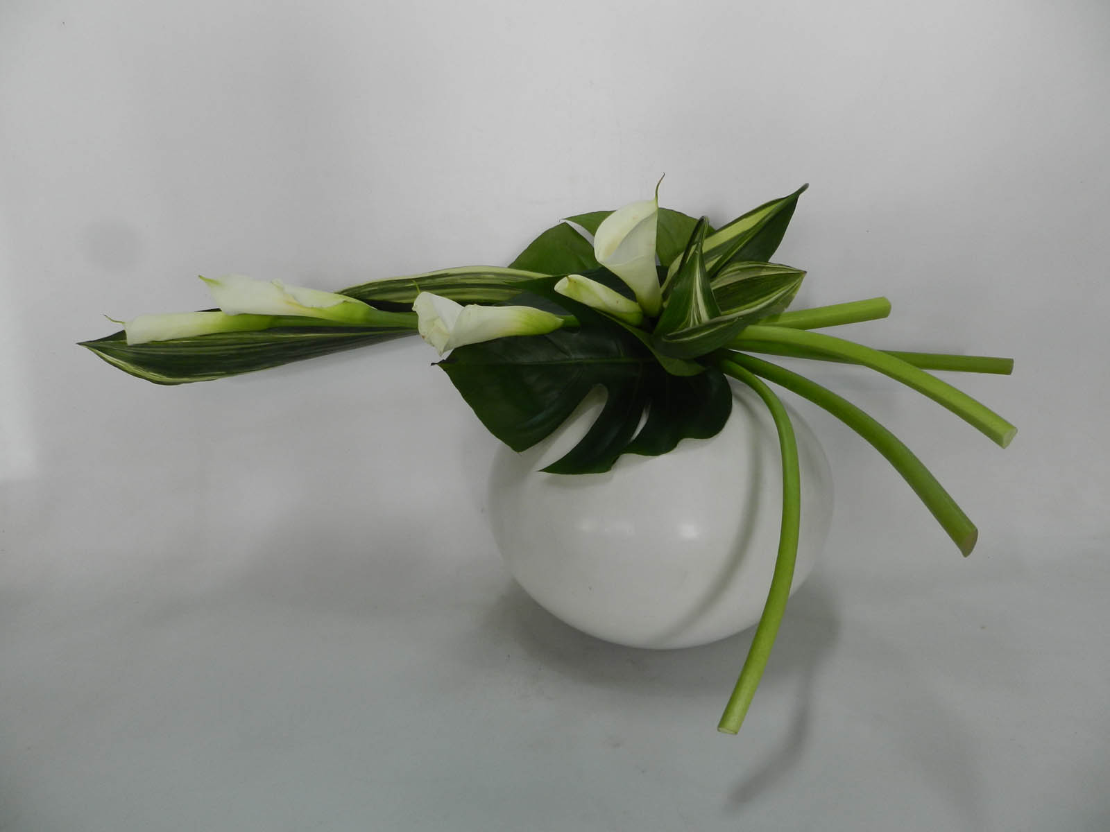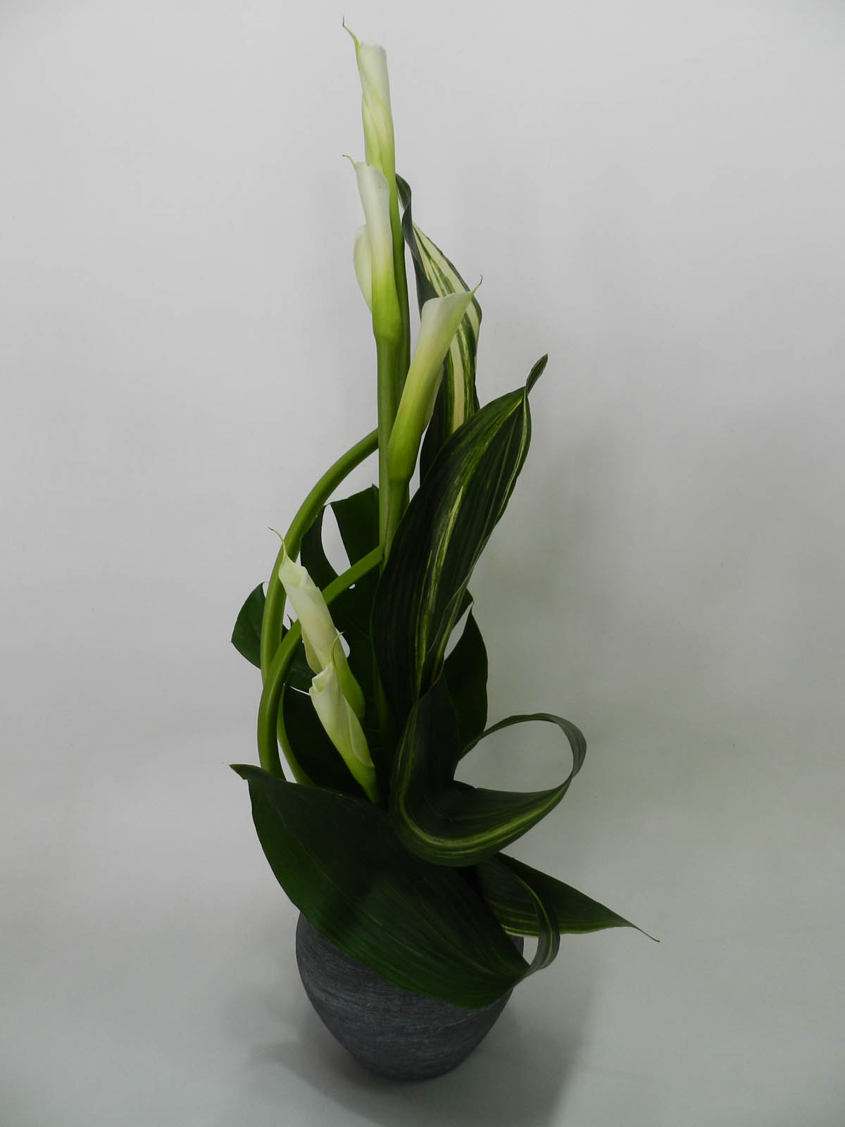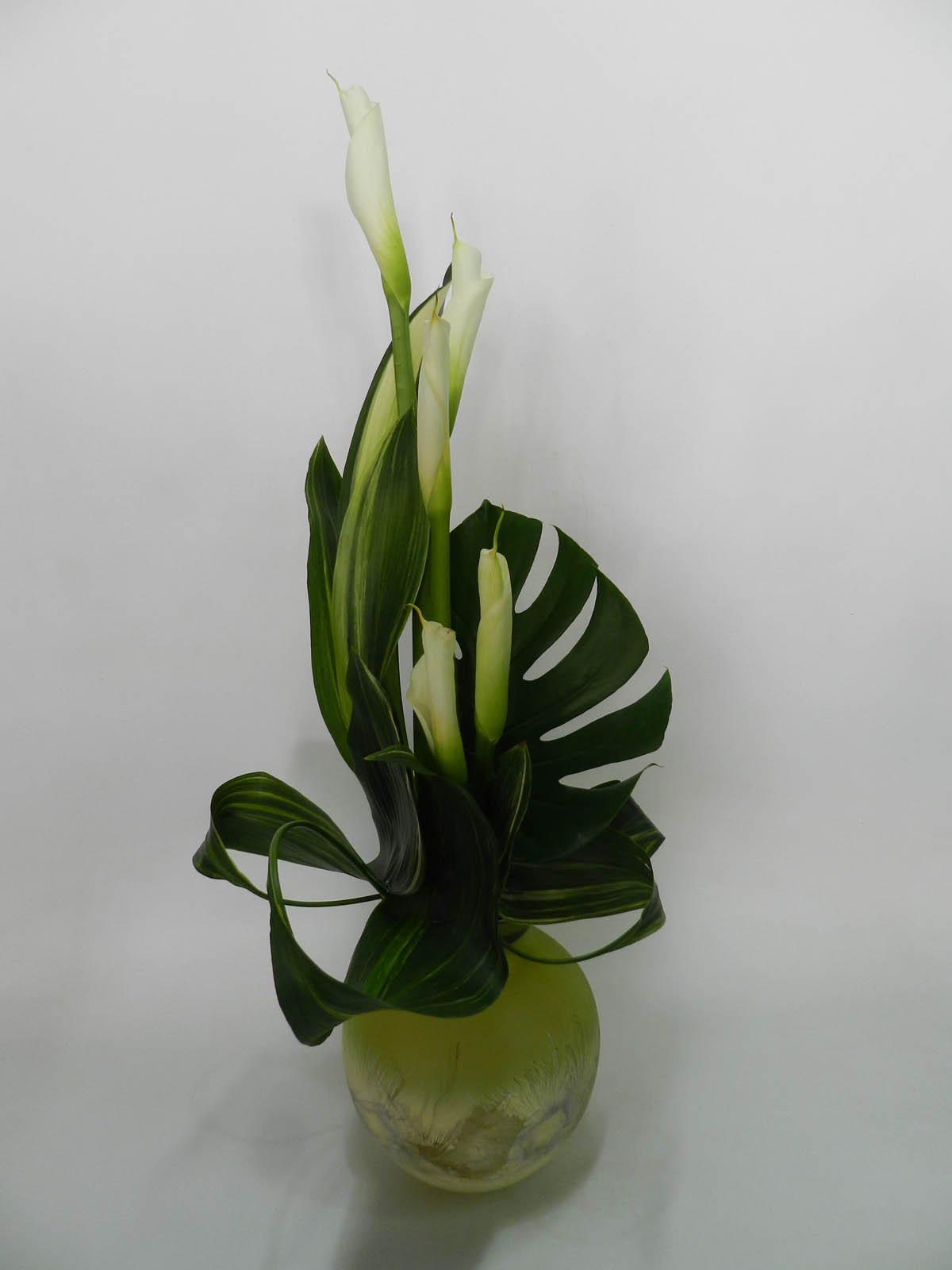 | Réalisation des élèves avec arum, phormium, aspidistra panaché, monstera … |