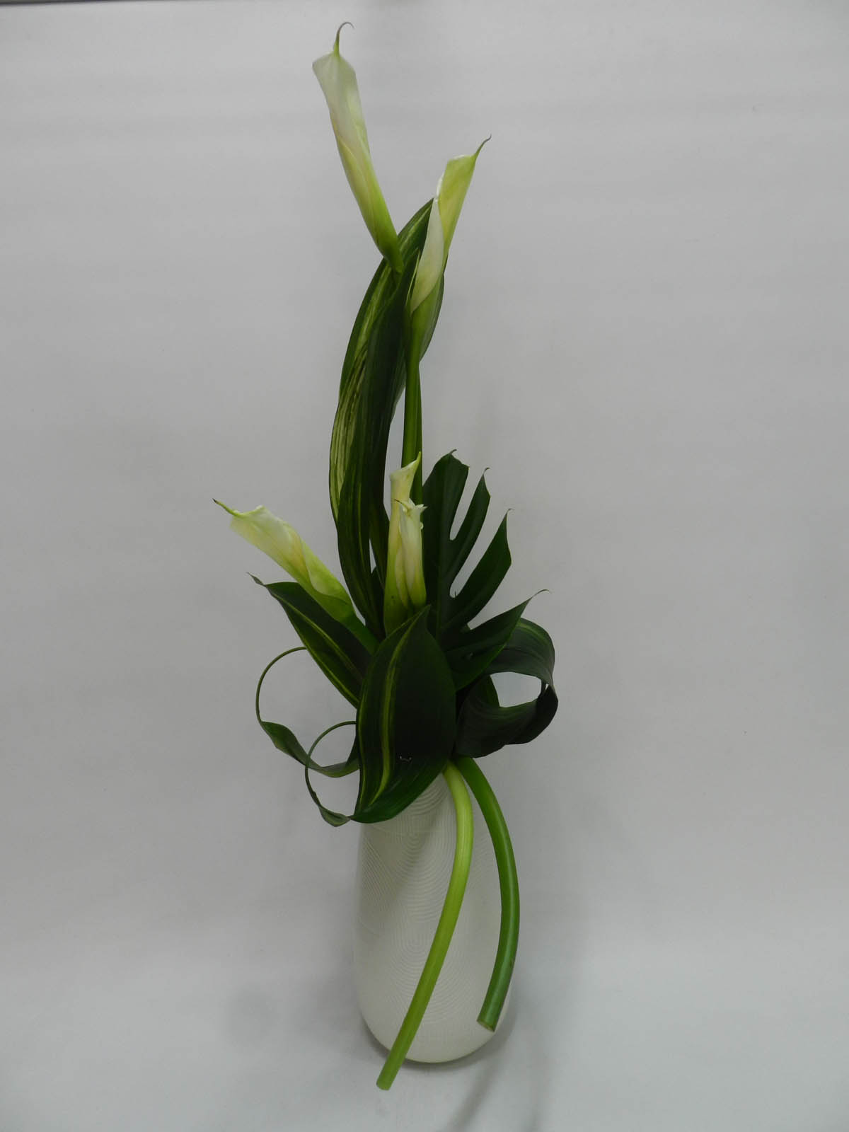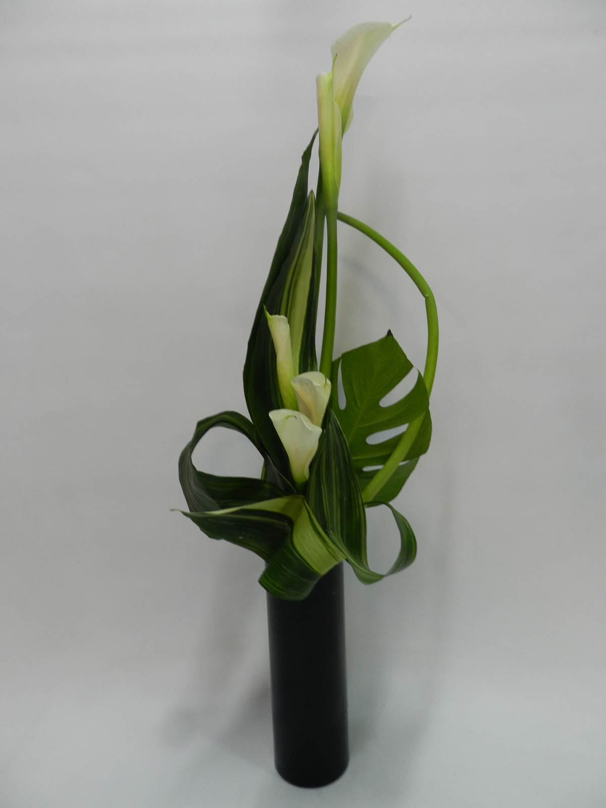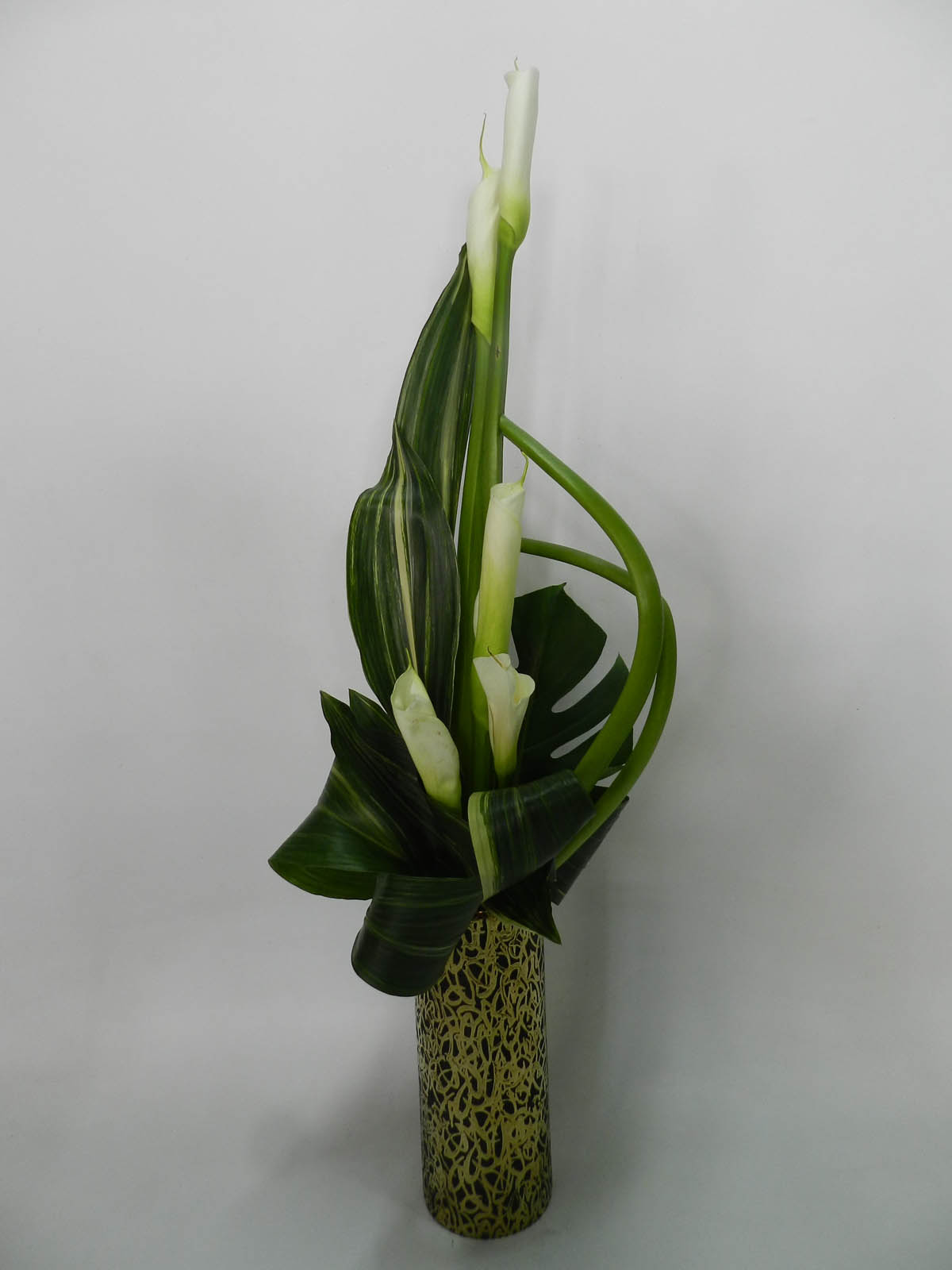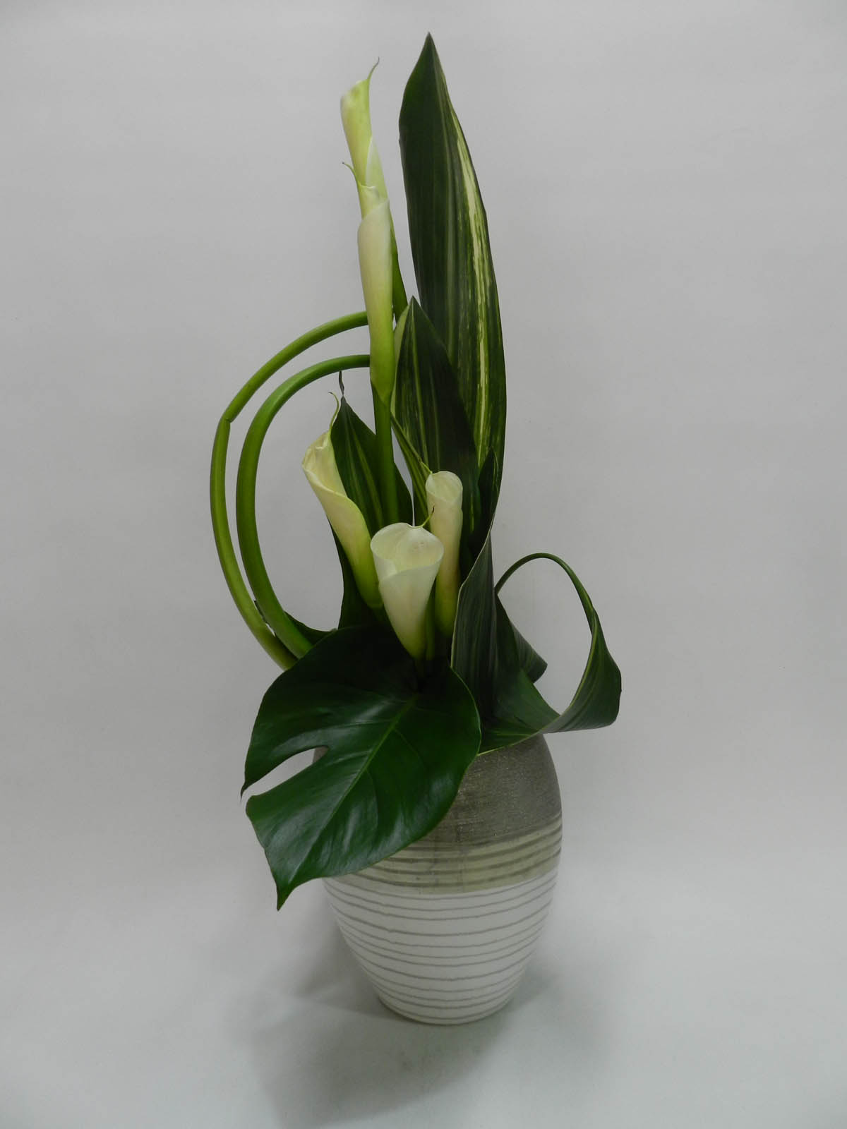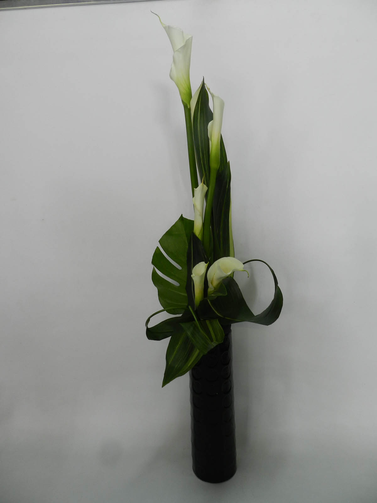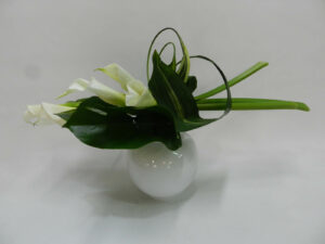 | Réalisation des élèves avec arum, phormium, aspidistra panaché, monstera … |