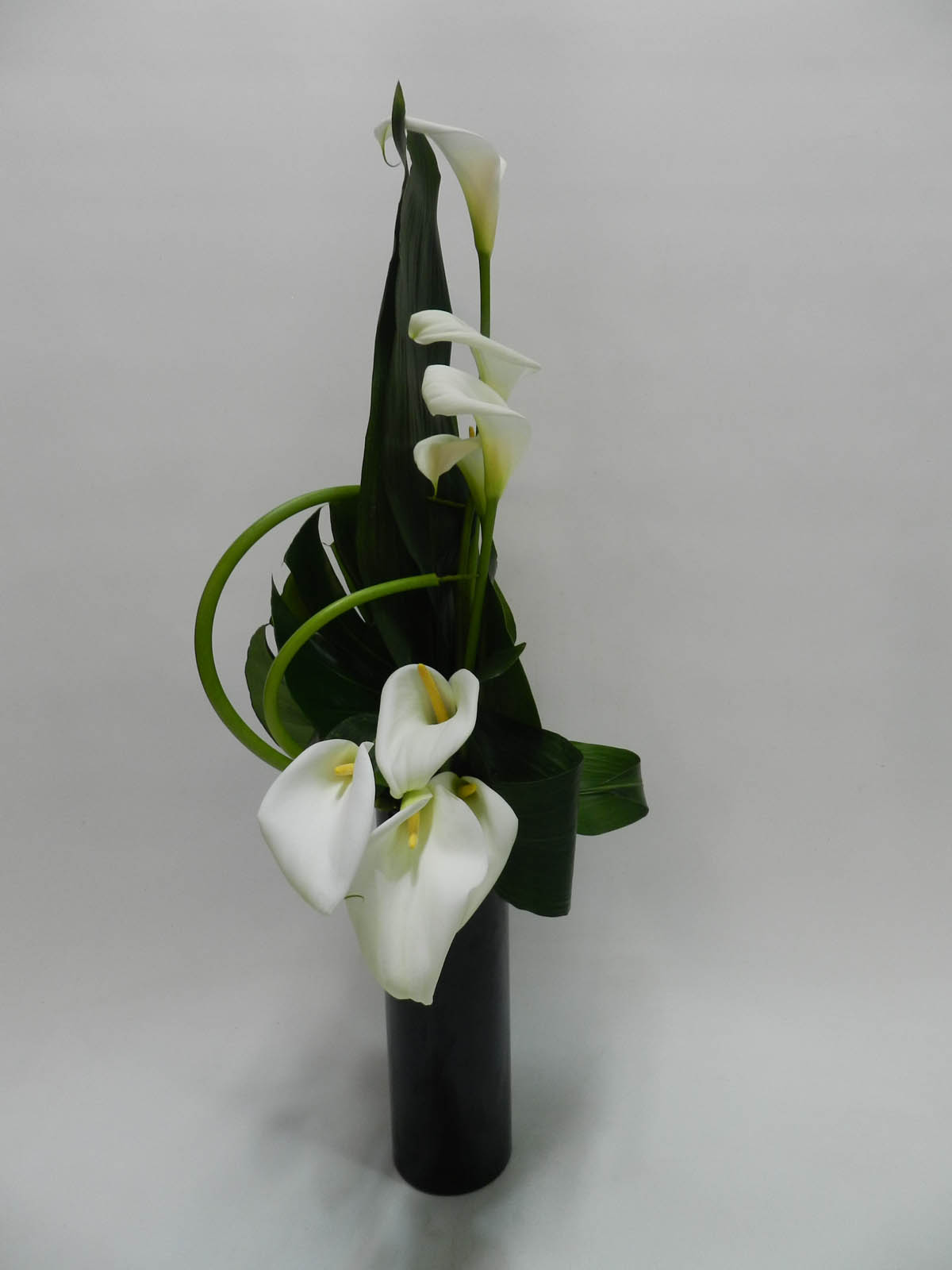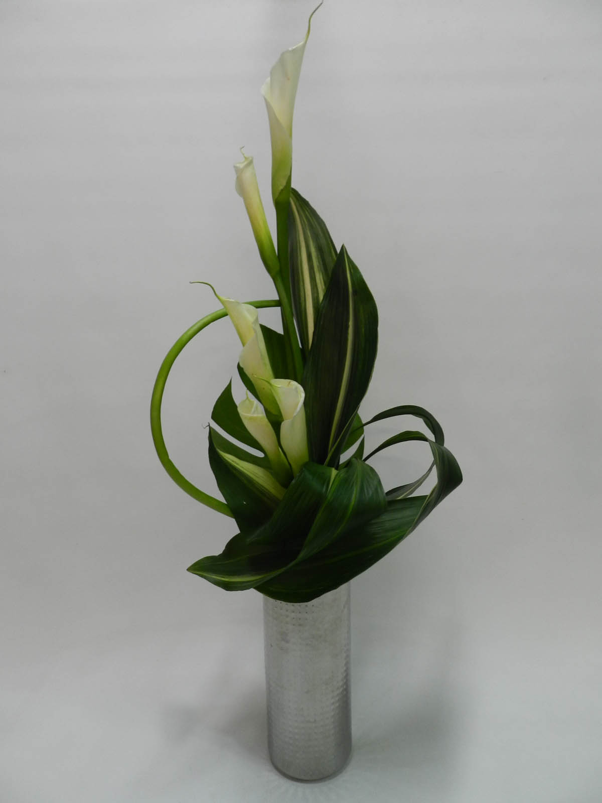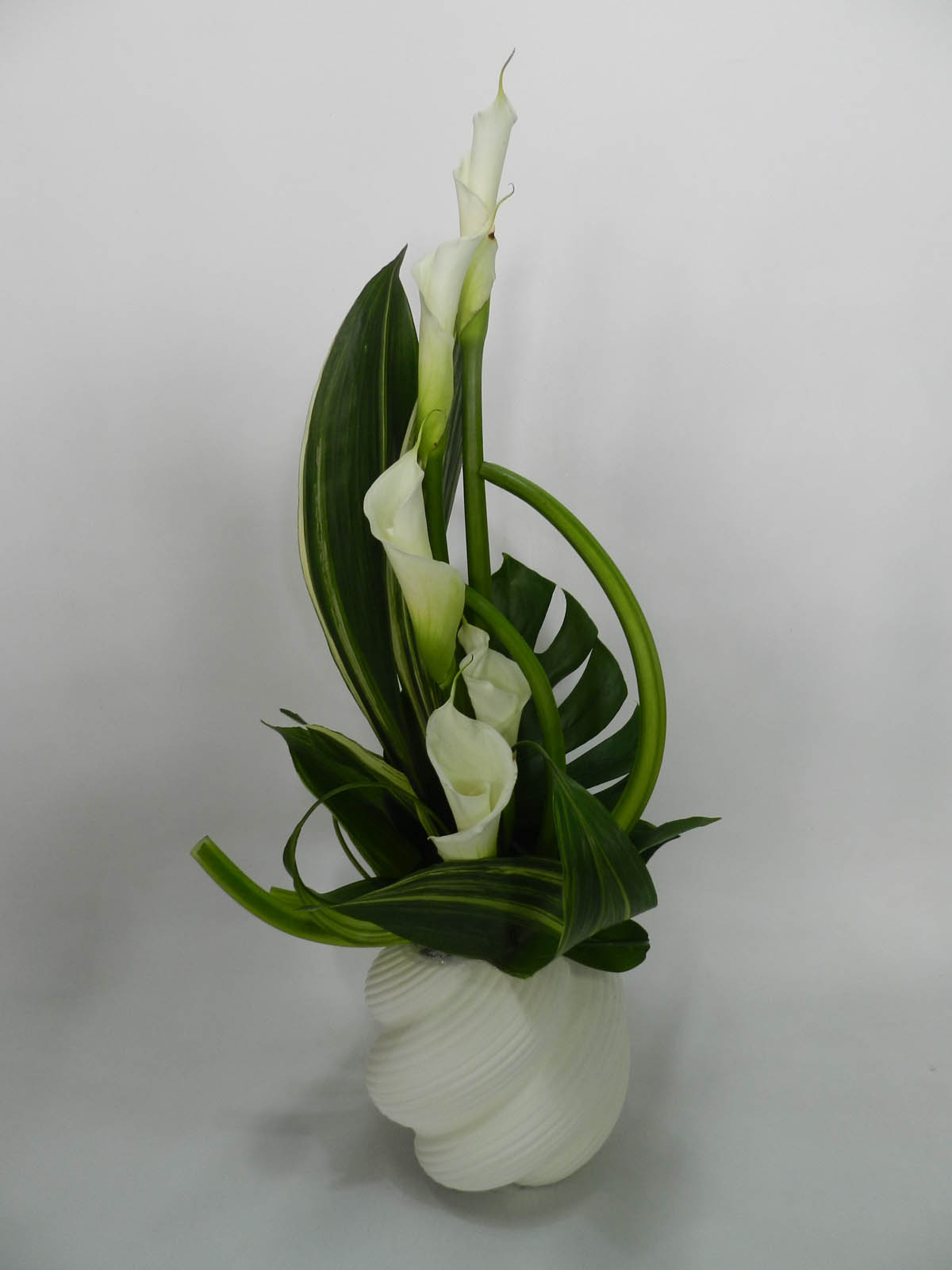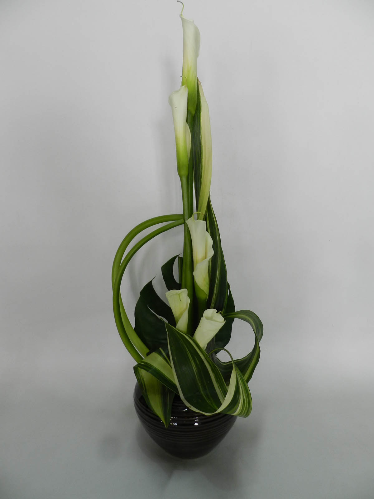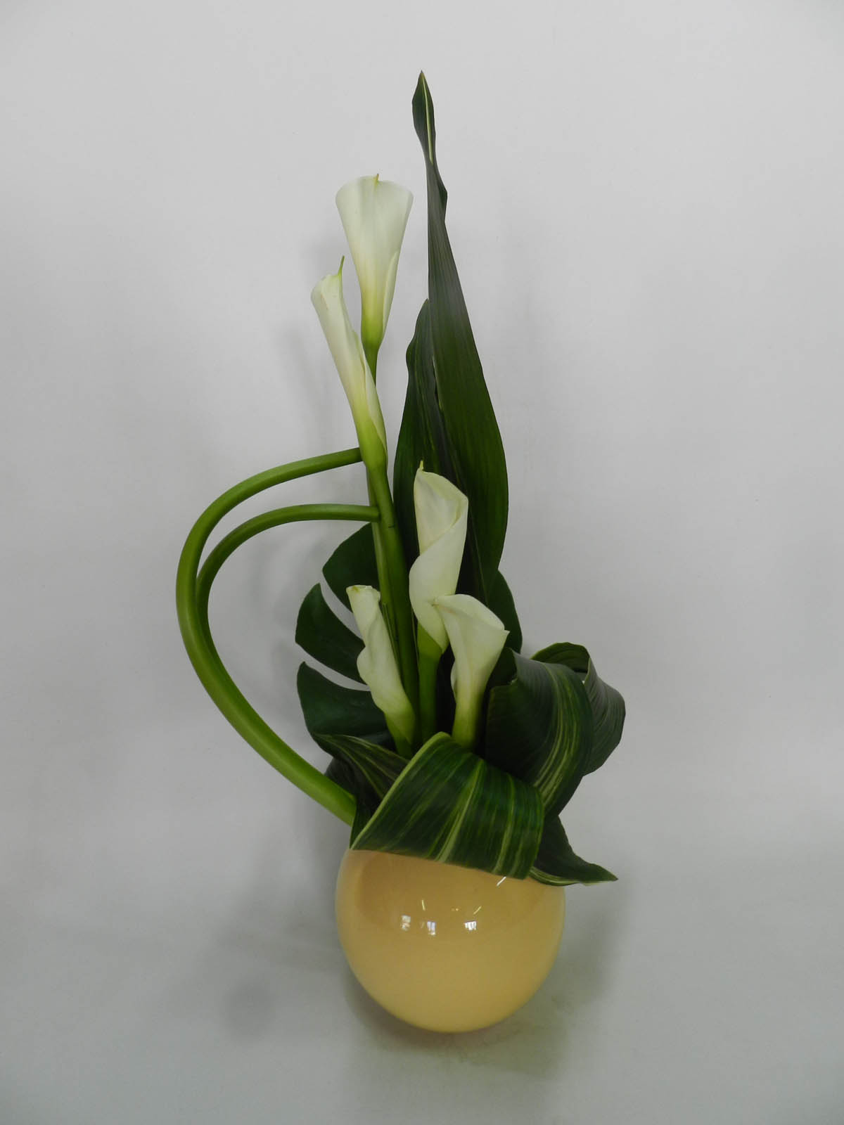 | Réalisation des élèves avec arum, phormium, aspidistra panaché, monstera … |